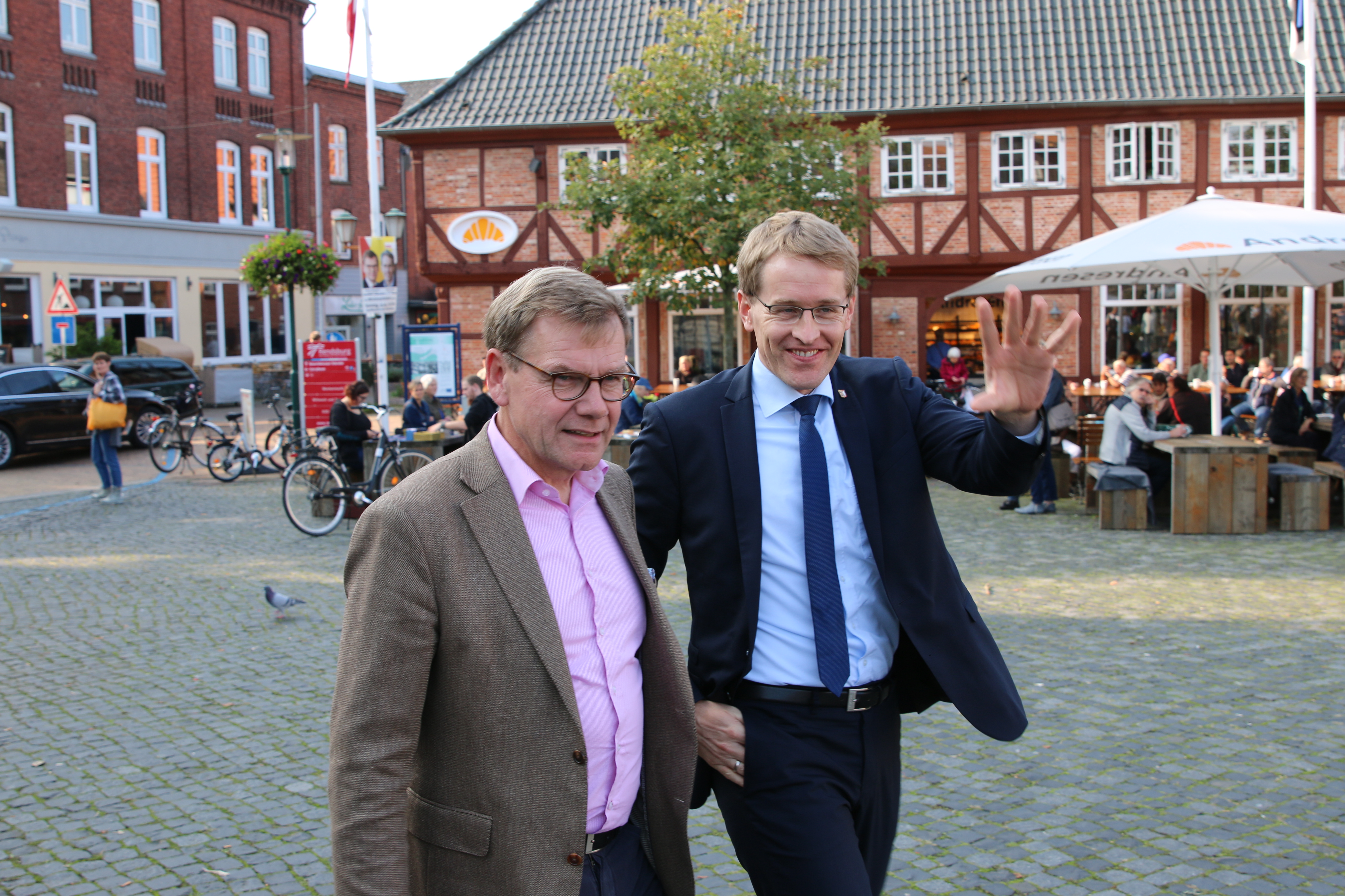 Zum Abschluss ihres 5-wöchigen Wahlkampfes lud die CDU Rendsburg-Eckernförde am Samstag, den 23. September zu einer Wahlkampfkundgebung auf den Schiffbrückenplatz nach Rendsburg mit Ministerpräsident Daniel Günther und ihrem Direktkandidaten Johann Wadephul. Bei bestem Spätsommerwetter riefen beide die rund 300 Gäste dazu auf, am folgenden Tag mit beiden Stimmen die CDU zu wählen. „In den Umfragen liegt die Union zwar stabil deutlich vor allen anderen politischen Parteien, aber es wird kein Selbstläufer. Wir bis morgen noch einmal alles geben, denn sonst werden wir nicht das erhoffte Ergebnis einfahren können“, so Wadephul bei seiner Rede. Er bedankte sich bereits bei allen freiwilligen Helferinnen und Helfern im Kreis, die ihn in den letzten Wochen im Rahmen des Tür-zu-Tür-Wahlkampfes oder bei Wahlkampfständen unterstützt hatten. Gleichzeitig warb er bei den Anwesenden ausdrücklich nochmals um ihr Vertrauen und versprach, sich im Bundestag insbesondere für eine Verbesserung der Verkehrssituation in Rendsburg-Eckernförde einzusetzen. „Es ist ein erster großer Erfolg, dass wir gemeinsam mit der CDU-geführten Landesregierung den Ausbau der Rader Hochbrücke auf insgesamt sechs Spuren erreichen konnten. Es gilt nun, die Sanierung des Kanaltunnels so schnell wie möglich zu beenden“, so Wadephul.