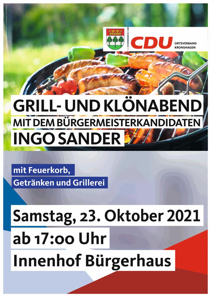 Die CDU Kronshagen und Bürgermeisterkandidat Ingo Sander laden ein zum Grill- und Klönabend im Innenhof des Bürgerhauses Kronshagen am Samstag, den 23.Oktober 2021 ab 17:00 Uhr.