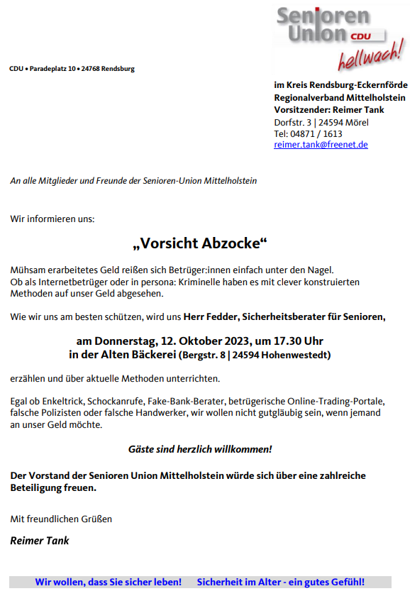 Die Senioren Union Mittelholstein lädt ein zu einem Informationsabend zum Thema Betrugsmaschen.